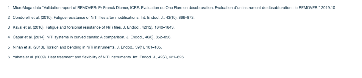 - Équilibre entre flexibilité et résistance : le matériau NiTi subit un traitement thermique exclusif, augmentant la flexibilité et la résistance à la fatigue cyclique2,3,4,5,6. Combine flexibilité et résistance pour faciliter la navigation dans les canaux courbes.